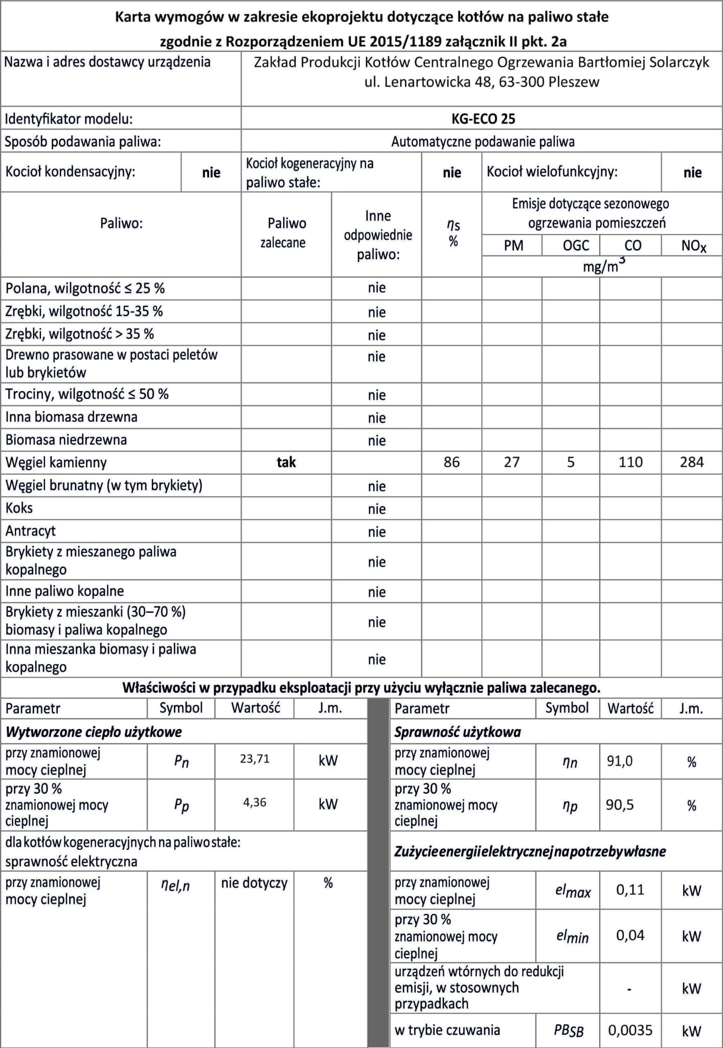 - karta produktu kotła
