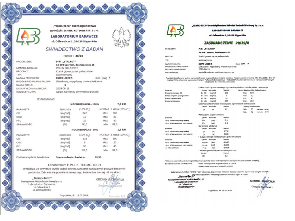 - atest potwierdzający zgodność z normą PN-EN 303- 5:2012 - 5 klasa i Ecodesign