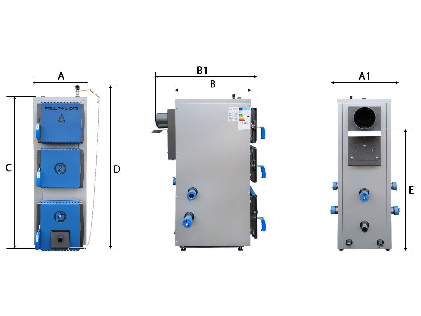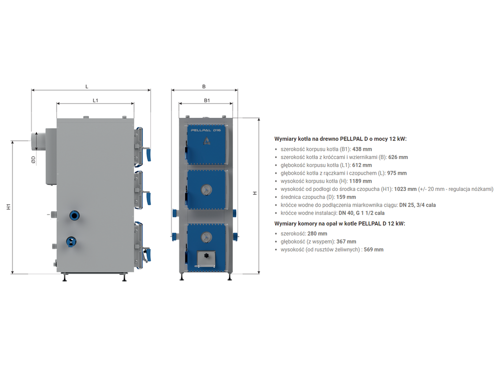Wymiary kotła na drewno PELLPAL D o mocy 12 kW: