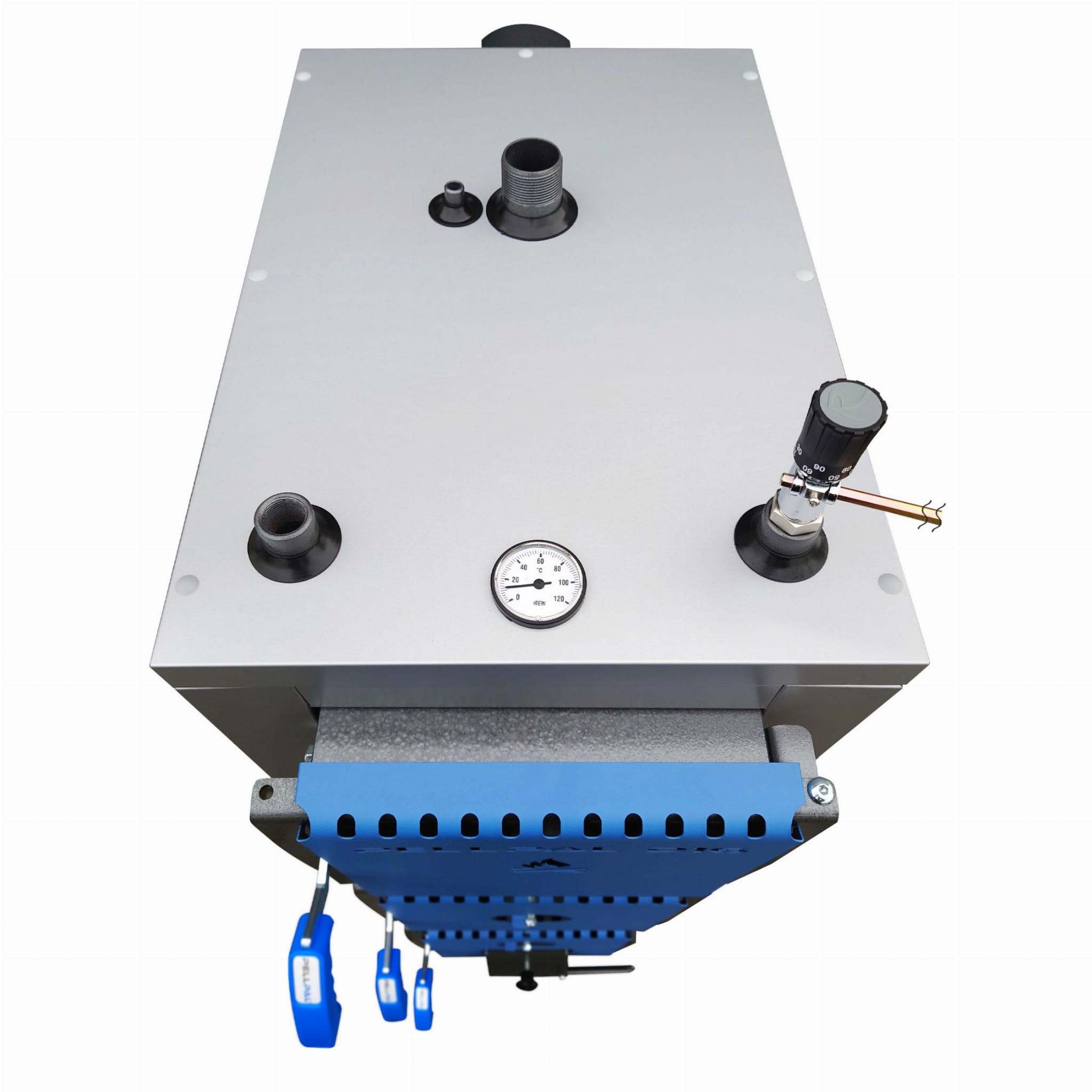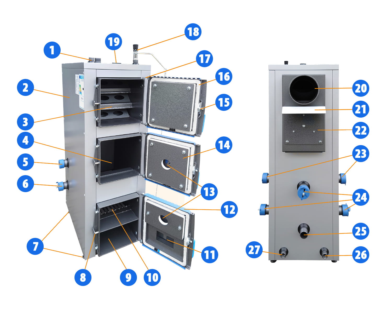 Kocioł wyposażony został w szczelnie zamykane drzwiczki umożliwiające obsługę kotła, załadunek opału, czyszczenie kanałów konwekcyjnych i komory spalania. W dolnych drzwiczkach zaprojektowana została klapka, której pozycja regulowana jest poprzez miarkownik ciągu powietrza Regulus. Wylot komina (czopuch) umieszczony jest z tyłu kotła. Króćce służące do podłączenia kotła do instalacji grzewczej znajdują się na górze kotła oraz w jego tylnej części. Na górze kotła znajdują się również króćce służące do montażu miarkownika ciągu sterującego pracą klapki dopływu powietrza.