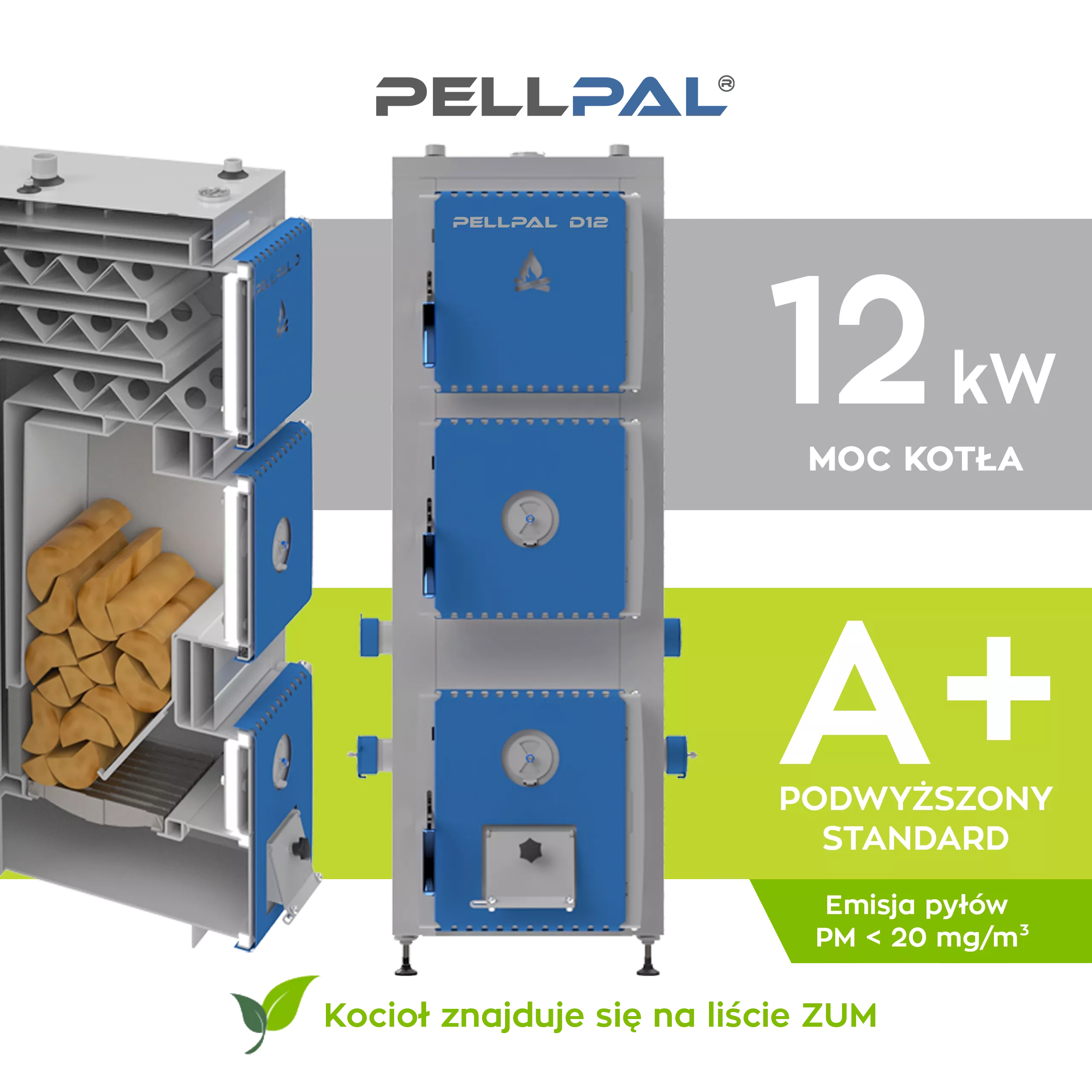 Kocioł piec PellPal D o mocy 12 kW to piec służący do spalania drewna - zagazowania drewna. Jest kotłem centralnego ogrzewania bez automatyki. Proces spalania opału regulowany jest poprzez miarkownik ciągu powietrza Regulus. Kocioł posiada komorę spalania wyposażoną w ruszt żeliwny. Spełnia wymogi normy EN 303-5 i ekoprojektu. Ma wysoką sprawność i w badaniach osiągnął klasę energetyczną A+. Kocioł doskonale nadaje się do ogrzewania budynków a także do ogrzewania wodny na potrzeby użytkowe. Może pracować w układzie otwartym ale również przy wyposażeniu instalacji grzewczej w niezbędne zabezpieczenia można go zamontować w układzie zamkniętym.