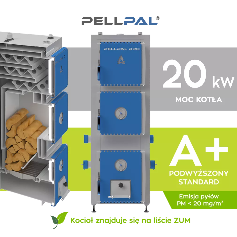 Kocioł piec PellPal D o mocy 20 kW to piec służący do spalania drewna - zagazowania drewna. Jest kotłem centralnego ogrzewania bez automatyki. Proces spalania opału regulowany jest poprzez miarkownik ciągu powietrza Regulus. Kocioł posiada komorę spalania wyposażoną w ruszt żeliwny. Spełnia wymogi normy EN 303-5 i ekoprojektu. Ma wysoką sprawność i w badaniach osiągnął klasę energetyczną A+. Kocioł doskonale nadaje się do ogrzewania budynków a także do ogrzewania wodny na potrzeby użytkowe. Może pracować w układzie otwartym ale również przy wyposażeniu instalacji grzewczej w niezbędne zabezpieczenia można go zamontować w układzie zamkniętym.